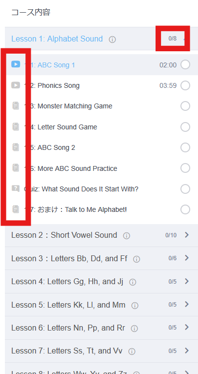 各レッスンのタイトルの右側には、セクションの総数と完了したセクションの比率が表示されています。