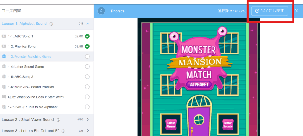 クイズのセッションも、クイズ終了後に次のセッションに進みますが、テキストレッスンのセッションでは、アクティビティ終了後に右上の「完了にします」ボタンをクリックしてセクションを終え次に移行します。