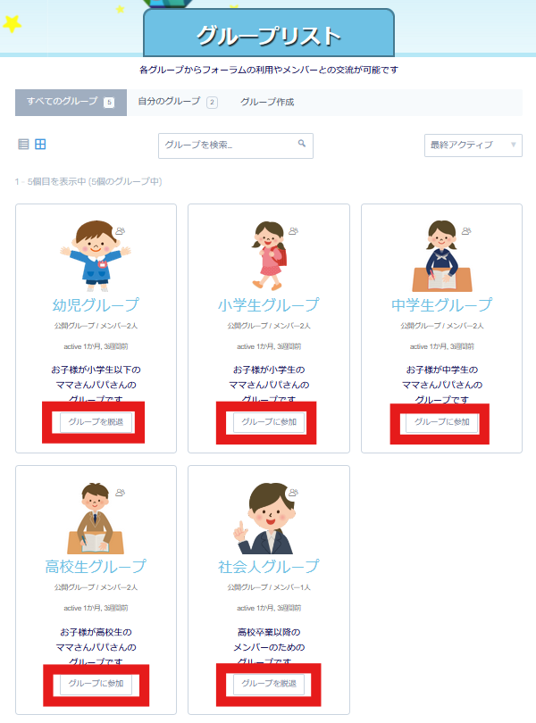 登録時に選択された受講者の学齢により、フォーラムのグループに自動参加されています。